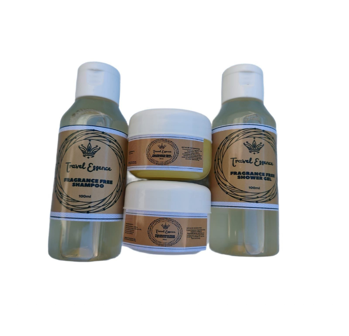 A complete toiletry kit including shampoo, shower gel, aqueous cream, and petroleum jelly — all fragrance-free and travel-friendly.